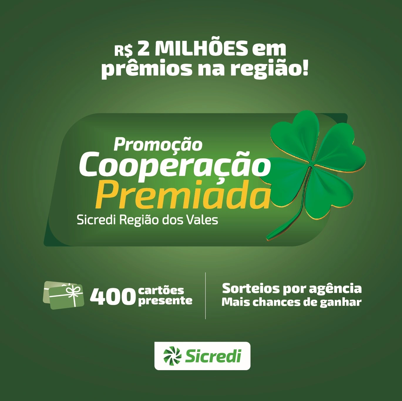 Com o objetivo de valorizar os associados que fazem seus negócios com o Sicredi e a parceria ao longo dos anos, o Sicredi Região dos Vales lançou nesta segunda-feira, 15 de abril, a Promoção Cooperação Premiada.