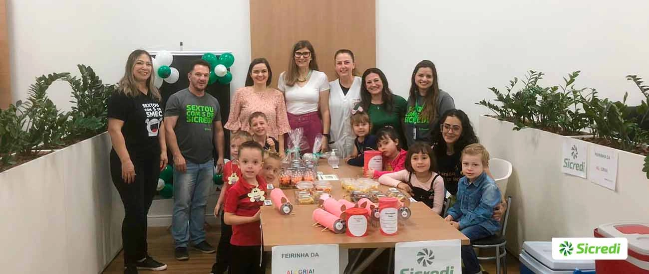 A agência da zona sul da Sicredi Parque das Araucárias PR/SC/SP, em Pato Branco, realizou a Feirinha da Alegria, com a exposição de receitas produzidas pelos alunos, de quatro a cinco anos, da educação infantil da Escola Municipal Irmã Dulce. O montante arrecado será utilizado para as crianças conhecerem o cinema, em comemoração ao mês de outubro, mês das crianças.