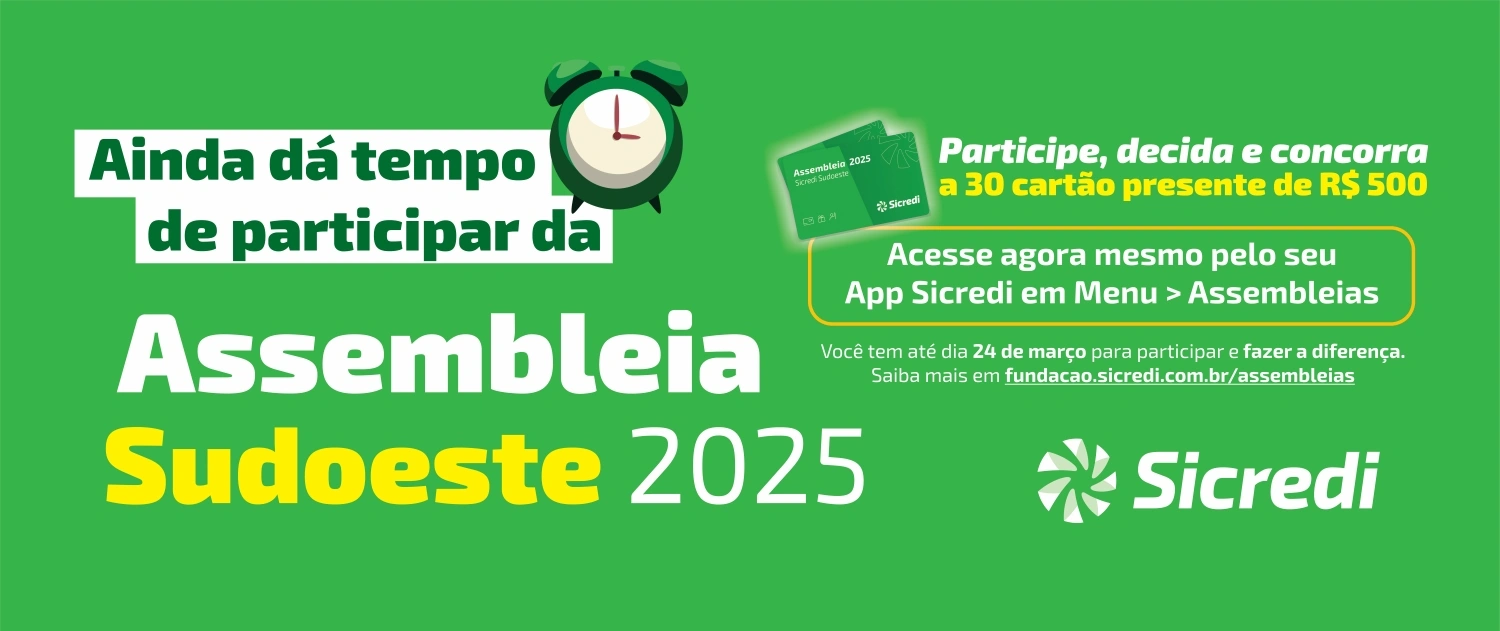 Os associados da Sicredi Sudoeste ainda têm a oportunidade de participar da Assembleia 2025, o evento mais importante da cooperativa. Com atuação no Mato Grosso e no Pará, a Sicredi Sudoeste convida todos os seus associados a assistirem e votarem nas pautas de interesse coletivo. A Assembleia de Núcleo 2025 começou no dia 6 de março e continuará até 24 de março. Para participar, basta acessar o APP Sicredi ou o Portal das Assembleias em https://fundacao.sicredi.com.br/assembleias/.
