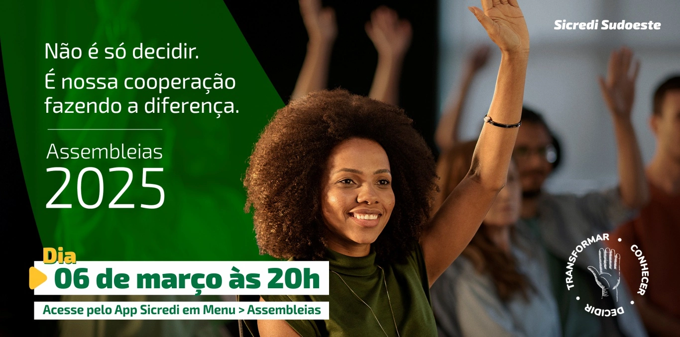 Você sabia que pode fazer a diferença nas decisões da sua cooperativa? As assembleias do Sicredi são momentos únicos onde você, associado, tem a chance de participar ativamente e ajudar a moldar o futuro do Sicredi. É a sua oportunidade de ser ouvido e construir um Sicredi ainda mais forte e alinhado com os interesses da nossa comunidade. Acesse no dia 06 de Março às 20h Brasília, através do Aplicativo Sicredi na aba Assembleias.
