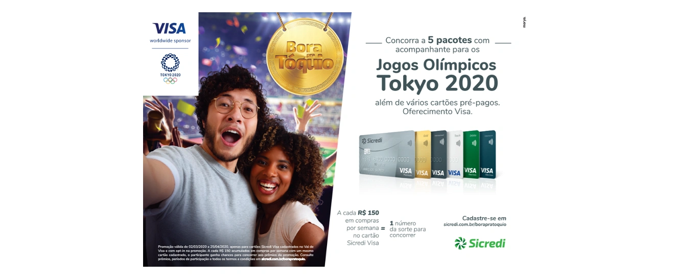 Para celebrar os Jogos Olímpicos Tokyo 2020, que acontecem entre julho e agosto no Japão, e fortalecer o relacionamento com os associados, a Visa, em parceria com o Sicredi – instituição financeira cooperativa com mais de 4,5 milhões de associados e atuação em 22 estados e no Distrito Federal – lança a campanha promocional “Bora pra Tóquio”. Na ação, os participantes concorrem a prêmios quinzenais de até R$ 1.000 em cartões pré-pagos, além de viagens para os Jogos Olímpicos oferecidas pela Visa.
