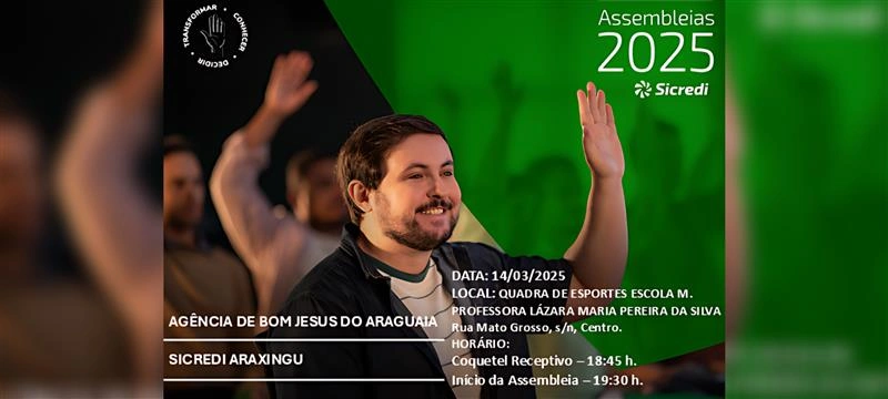 A Sicredi Araxingu, maior instituição financeira cooperativa genuína da região, realiza hoje, 14 de março, a Assembleia da agência de Bom Jesus do Araguaia/MT, na Quadra de Esportes Escola Municipal Professora Lázara Maria Pereira da Silva. O evento inicia às 18h45, com um coquetel de boas-vindas.