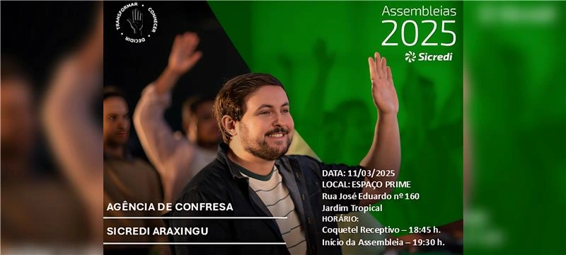 A Sicredi Araxingu, maior instituição financeira cooperativa da região, realiza hoje, 11 de março, a Assembleia da agência de Confresa/MT, no Espaço Prime. O evento inicia às 18h45, com um coquetel de boas-vindas.
