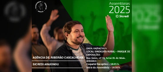 A Sicredi Araxingu, maior instituição financeira cooperativa genuína da região, realizará nesta sexta-feira, 04 de abril, Assembleia em Ribeirão Cascalheira/MT. O encontro acontecerá no Sindicato Rural - Parque de Exposições, com início às 18h45, acompanhado de um coquetel de recepção para os participantes.