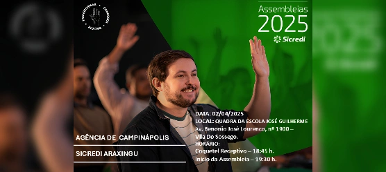 A Sicredi Araxingu, maior instituição financeira cooperativa genuína da região, realizará nesta sexta-feira, 02 de abril, Assembleia em Campinápolis/MT. O encontro acontecerá na quadra da Escola José Guilherme, com início às 18h45, acompanhado de um coquetel de recepção para os participantes.