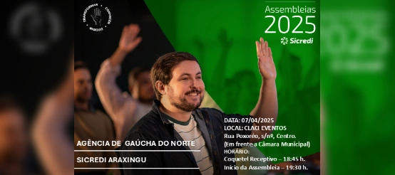 A Sicredi Araxingu, maior instituição financeira cooperativa genuína da região, realizará nesta segunda-feira, 07 de abril, Assembleia em Gaúcha do Norte/MT. O encontro acontecerá no Claci Eventos, com início às 18h45, acompanhado de um coquetel de recepção para os participantes.