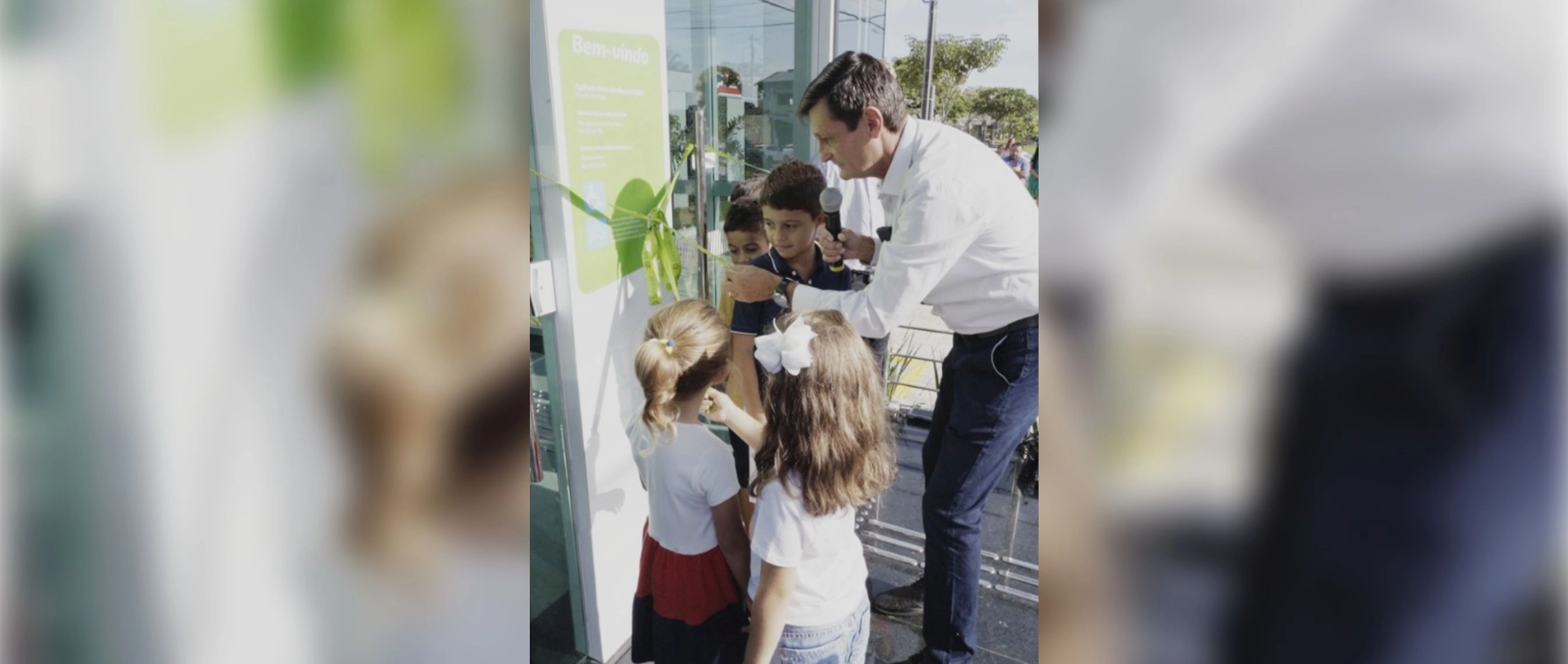 “As crianças são o futuro, e é por isso que eu gostaria de convidar as crianças que estão aqui presentes para retirarem a faixa inaugural e entrarem em nossa agência”, afirmou o presidente.