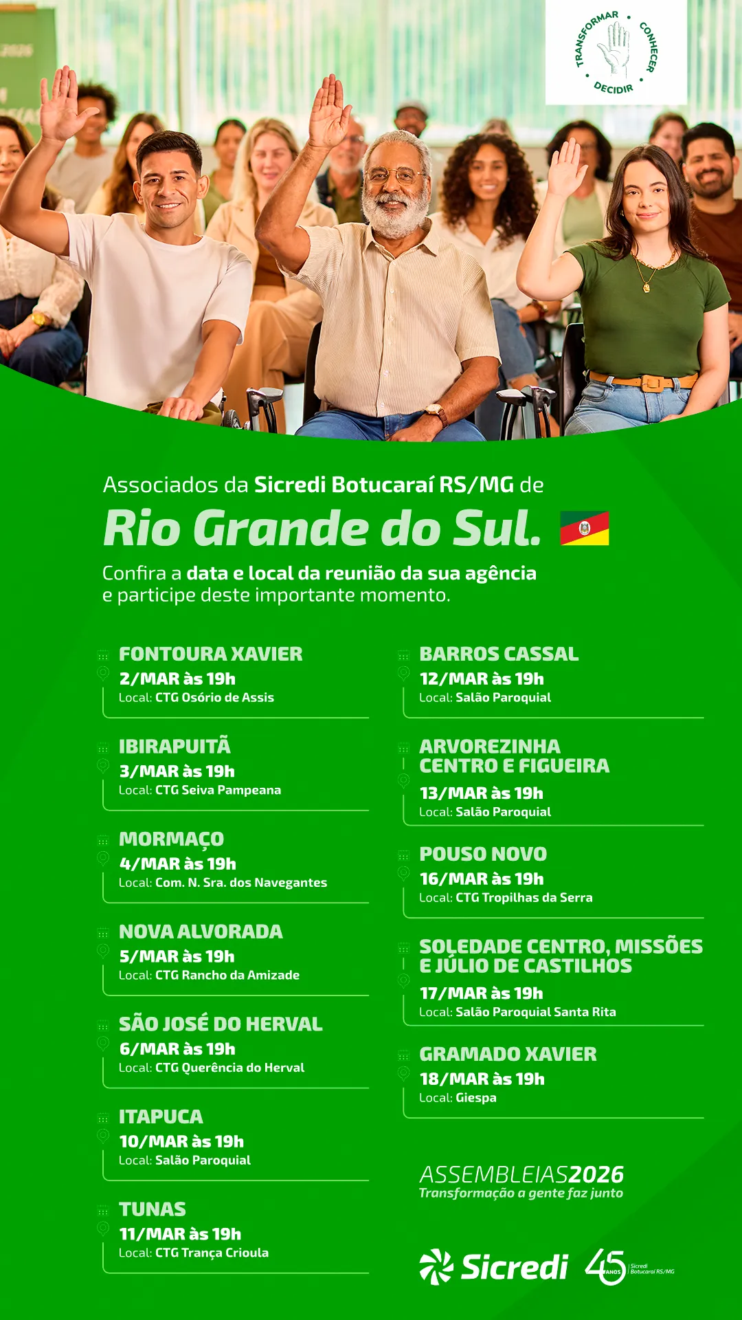 No Sicredi, temos a convicção de que transformação a gente faz junto. Por isso, este momento é tão especial. As Assembleias são o espaço onde reafirmamos nossa união, fortalecemos a cooperação e decidimos, juntos, os caminhos que vão impulsionar o desenvolvimento da Cooperativa. Por isso, cada presença importa. Cada voz importa. Cada voto importa.