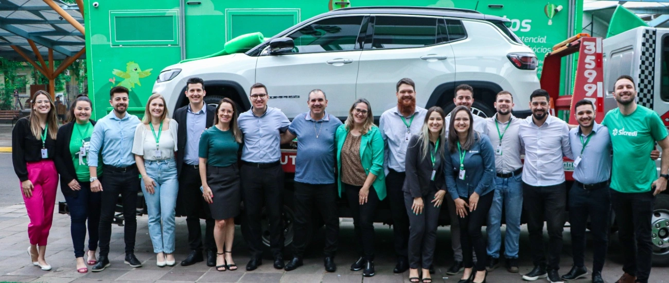 Equipe da Sicredi Caminho das Águas com os ganhadores da Jeep Compass. Crédito: Lucas Willers.