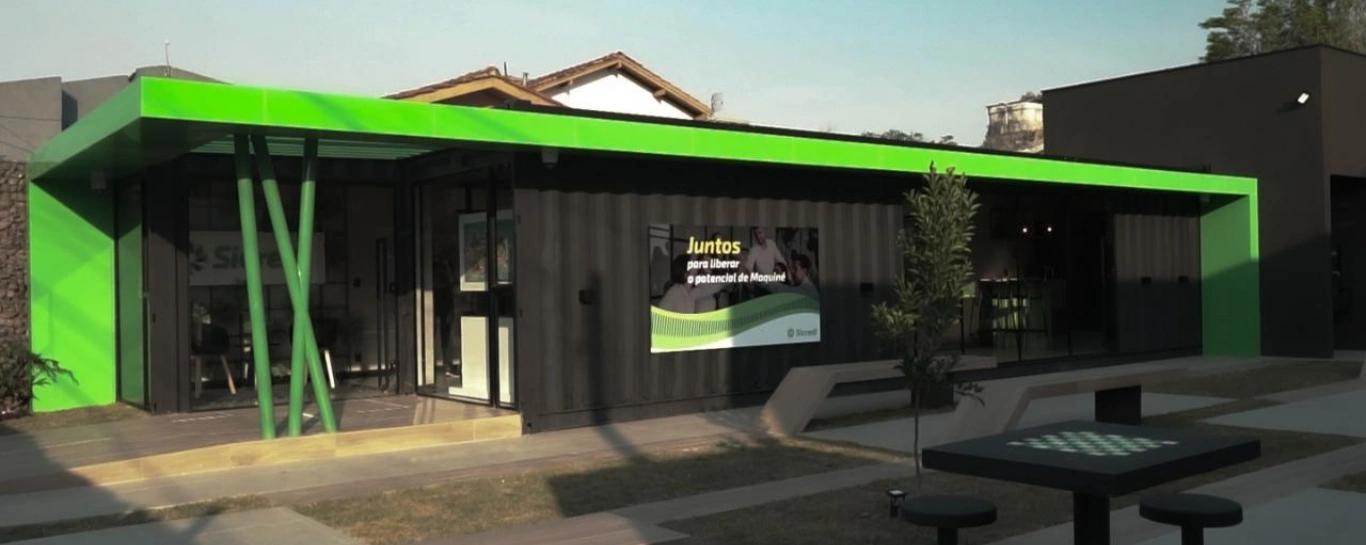 Formulada utilizando dois contêineres, a agência oferece acolhimento tanto para quem busca soluções financeiras, quanto para quem quer realizar uma atividade individual ou coletiva, por meio dos seus ambientes inovadores. A nova agência possui áreas de convivência externa, com jardim, espreguiçadeira, chimarródomo e parquinho para crianças; espaços internos de co-working, com uma arena para ser usada em palestras e eventos; cozinha para uso coletivo, com coffee place; além de muito verde, tanto nos espaços internos quanto nos externos.