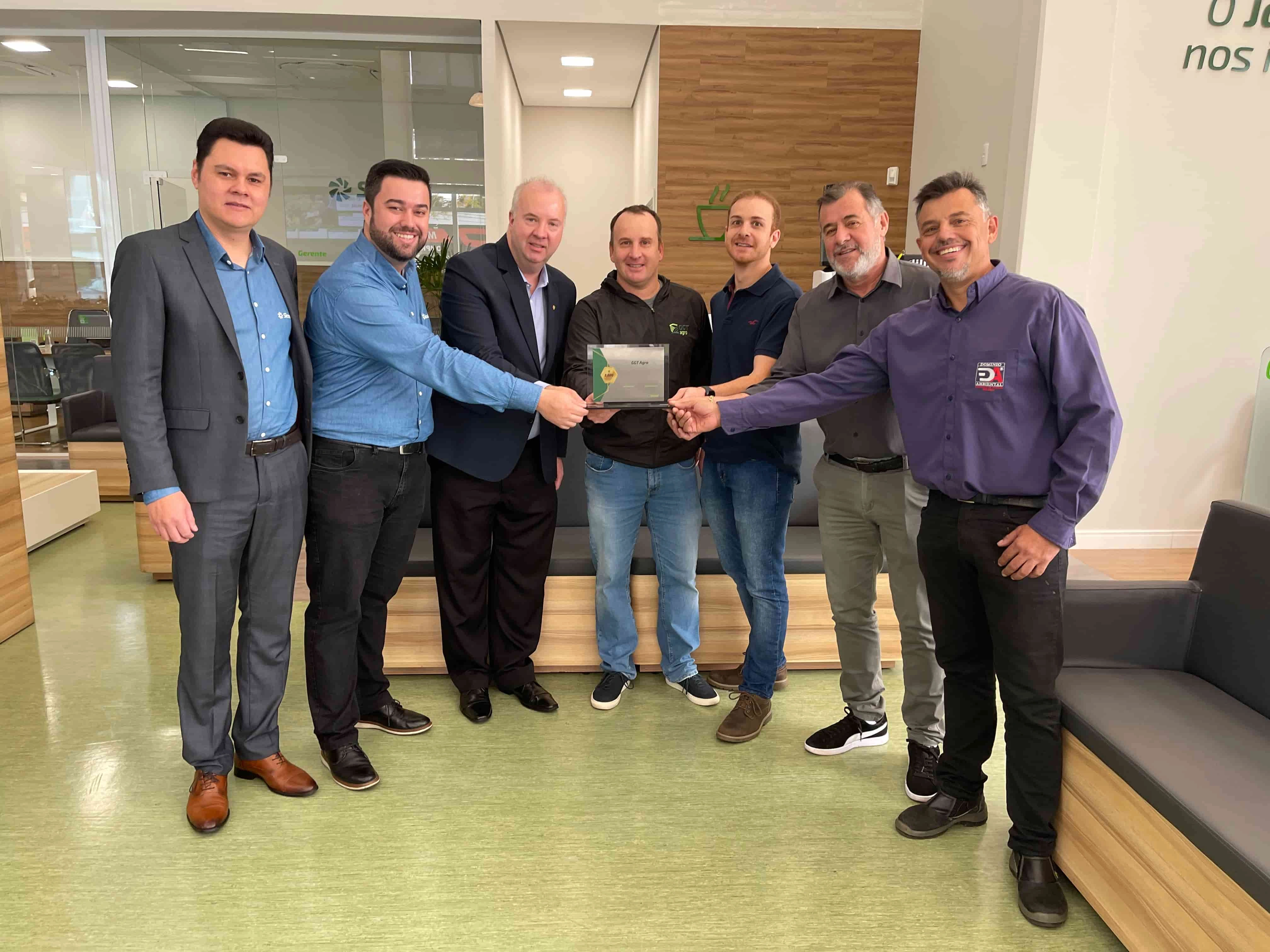 Para celebrar a marca de dois mil associados, uma placa de reconhecimento foi entregue para a empresa GGT Agro. Os empreendedores Guilherme Valente Alberti e Gustavo Valente Alberti foram recepcionados pela equipe. “Ser reconhecido como associado 2.000 foi um momento marcante. Conhecemos toda a estrutura da agência, conversamos com o presidente e com a equipe. O que me levou a abrir a conta aqui foi a facilidade da comunicação com os gerentes e proximidade com a agência e pelo crescimento que a cooperativa está tendo. Recomendo para os meus amigos pelo trabalho que fazem na comunidade e pelo excelente atendimento”, afirma Guilherme.