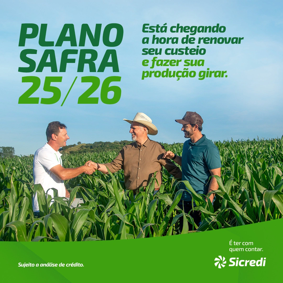 O Sicredi já está recebendo pedidos de financiamento para o Plano Safra 2025/2026, que vai de julho deste ano até o final de junho de 2026. Para solicitar o crédito, o produtor rural associado deve planejar a próxima safra, considerando o que será cultivado, a área de plantio e o orçamento. Em seguida, é indicado que o associado procure sua agência ou utilize os canais digitais, como o aplicativo do Sicredi e o WhatsApp, para dar andamento ao seu atendimento.