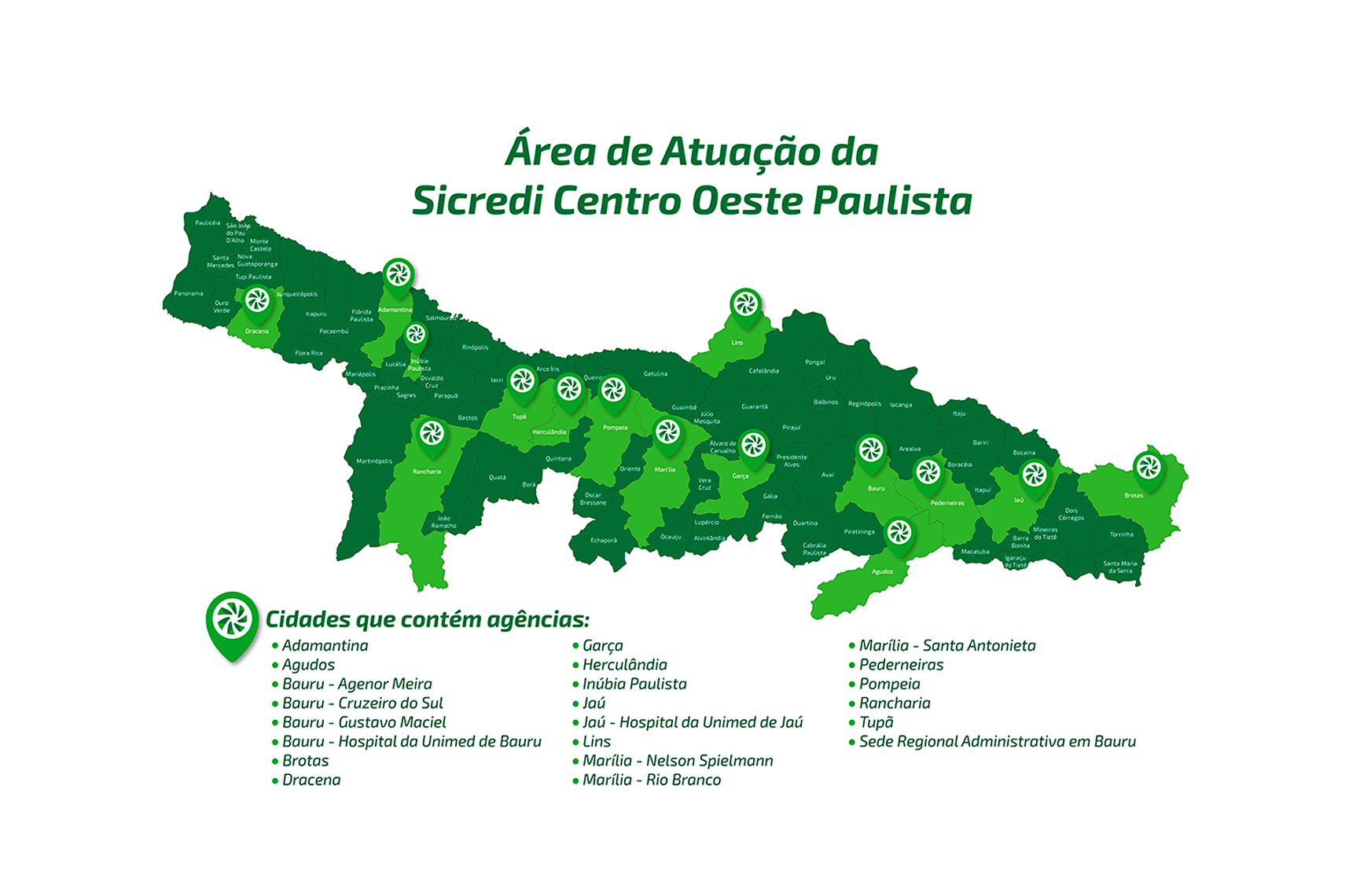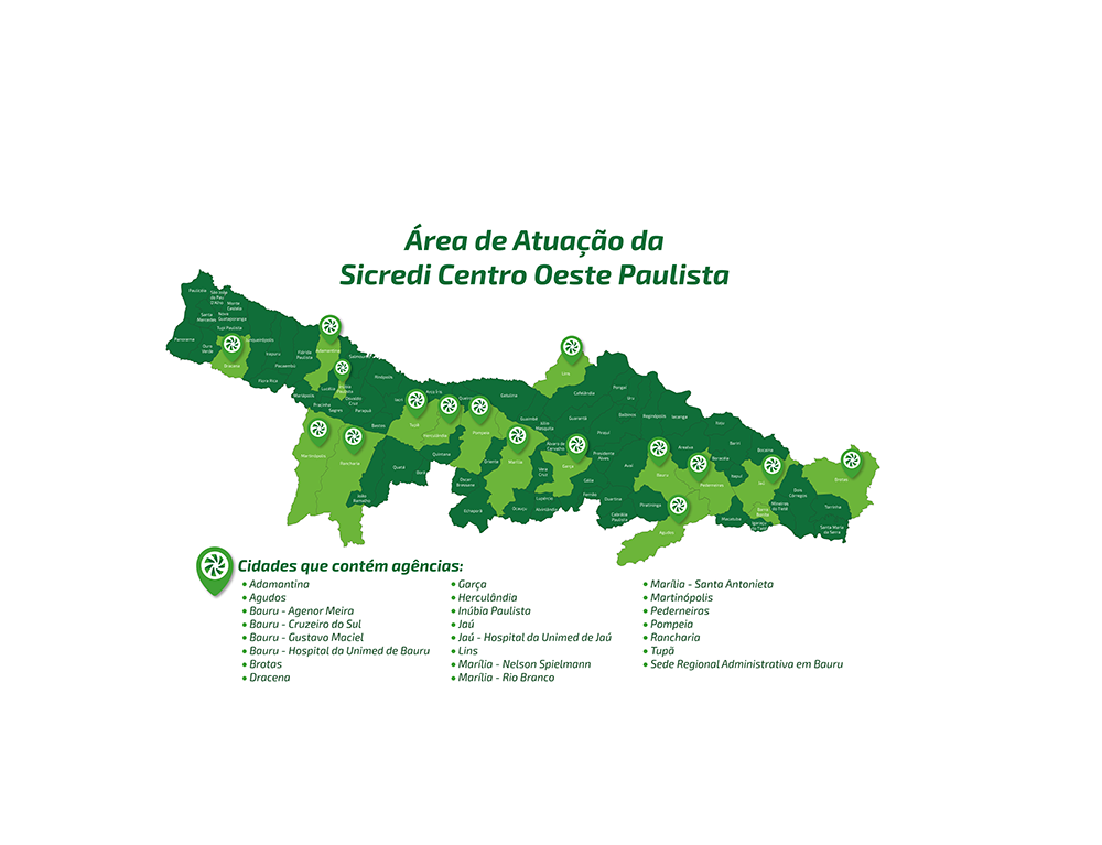 Em busca de fortalecer nossa presença regional, as cooperativas Sicredi Centro Oeste (Marília), Sicredi Centro Paulista (Bauru) e Sicredi Nova Alta Paulista (Dracena) se uniram em 5 de novembro de 2016, formando a Sicredi Centro Oeste Paulista. Essa fusão permitiu a criação de uma cooperativa de crédito mais sólida e com maior capacidade de promover o desenvolvimento econômico local. Entramos em 2025 comemorando as nossas bodas de prata, com uma área de abrangência de 84 municípios no estado de São Paulo - de Brotas à Panorama - e em constante expansão. Com mais de 65 mil associados e 24 agências distribuídas em 17 municípios da nossa região, seguimos prestando um serviço de excelência, cuidando dos associados e difundindo nosso diferencial que é o cooperativismo. Fazemos parte do sistema Sicredi, a primeira instituição financeira cooperativa do Brasil, com mais de 120 anos de história. Nosso modelo de gestão, que valoriza a participação ativa dos associados, conta com mais de 9 milhões de associados e 2,8 mil agências espalhadas pelos 26 estados e no Distrito Federal.
