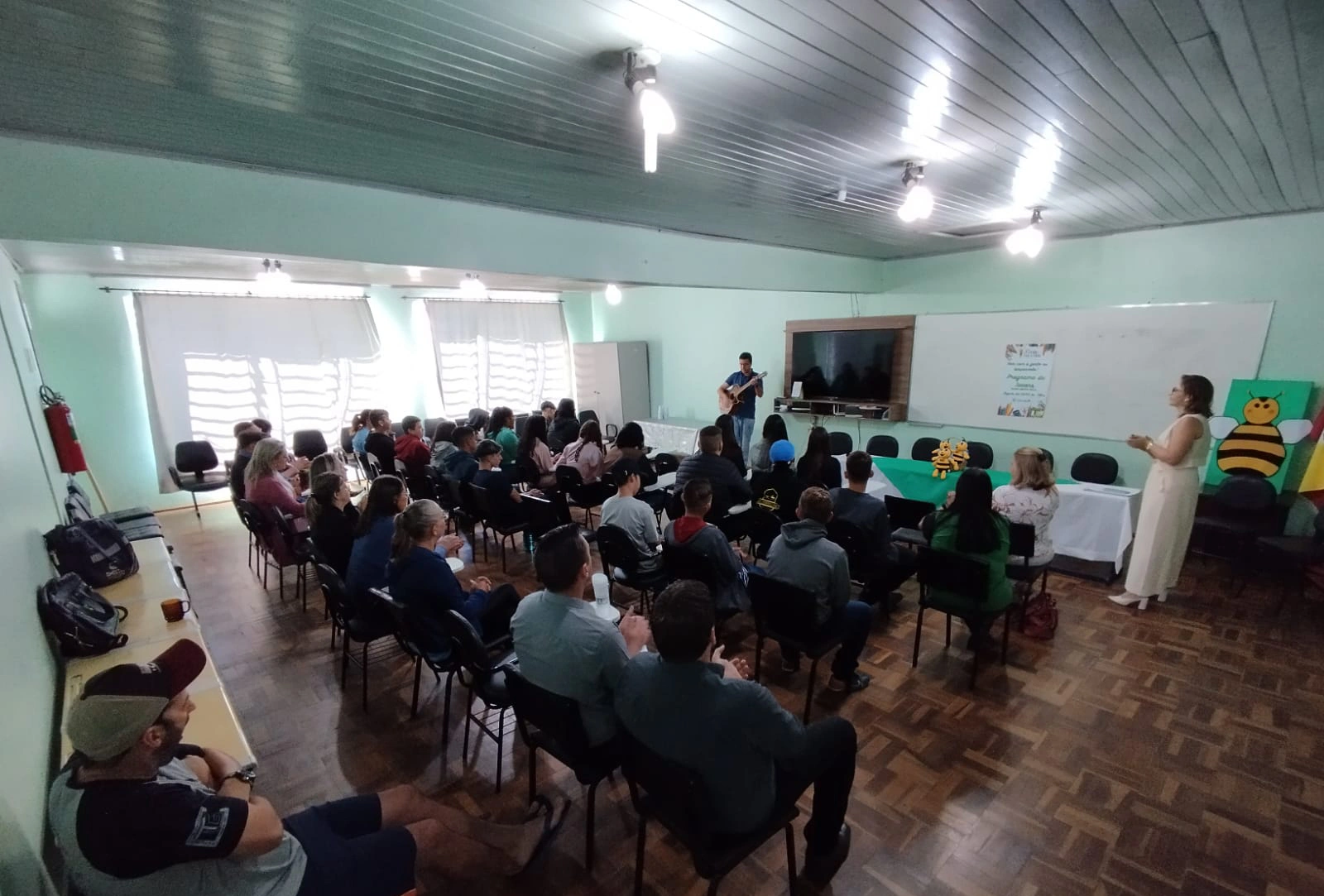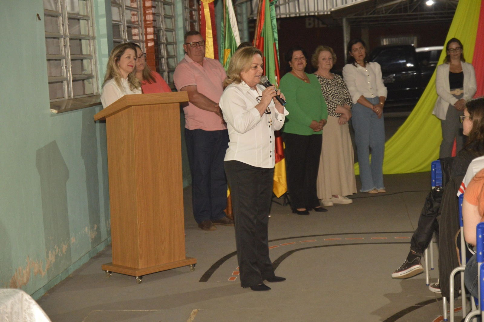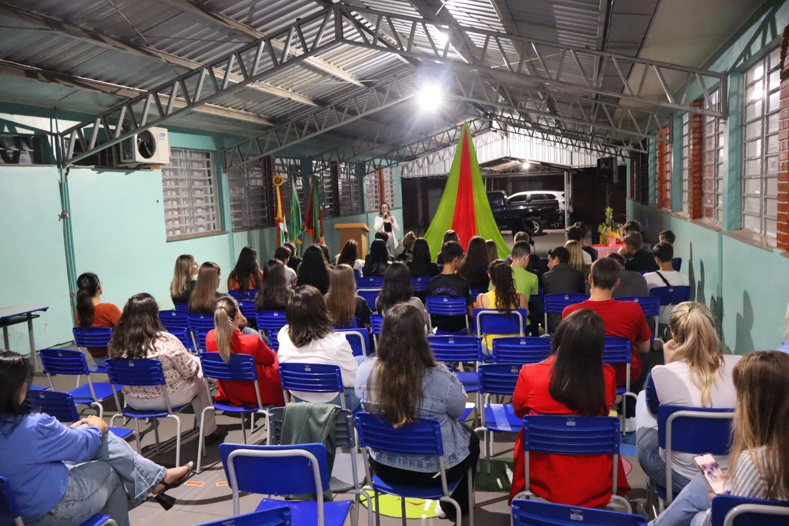 Já na parte da noite, foi a vez da Escola Estadual de Ensino Médio Estrela Velha receber seu evento de lançamento, repleto de energia e entusiasmo. Assim como em Lagoão, Luci e Danieli apresentaram o projeto para a comunidade escolar em solenidade que contou com a presença da gerente do Sicredi em Estrela Velha, Luciara Wachholz, além de representantes ligados a educação do município. As mensagens transmitidas reforçaram a visão de futuro e a importância do engajamento juvenil no crescimento coletivo.