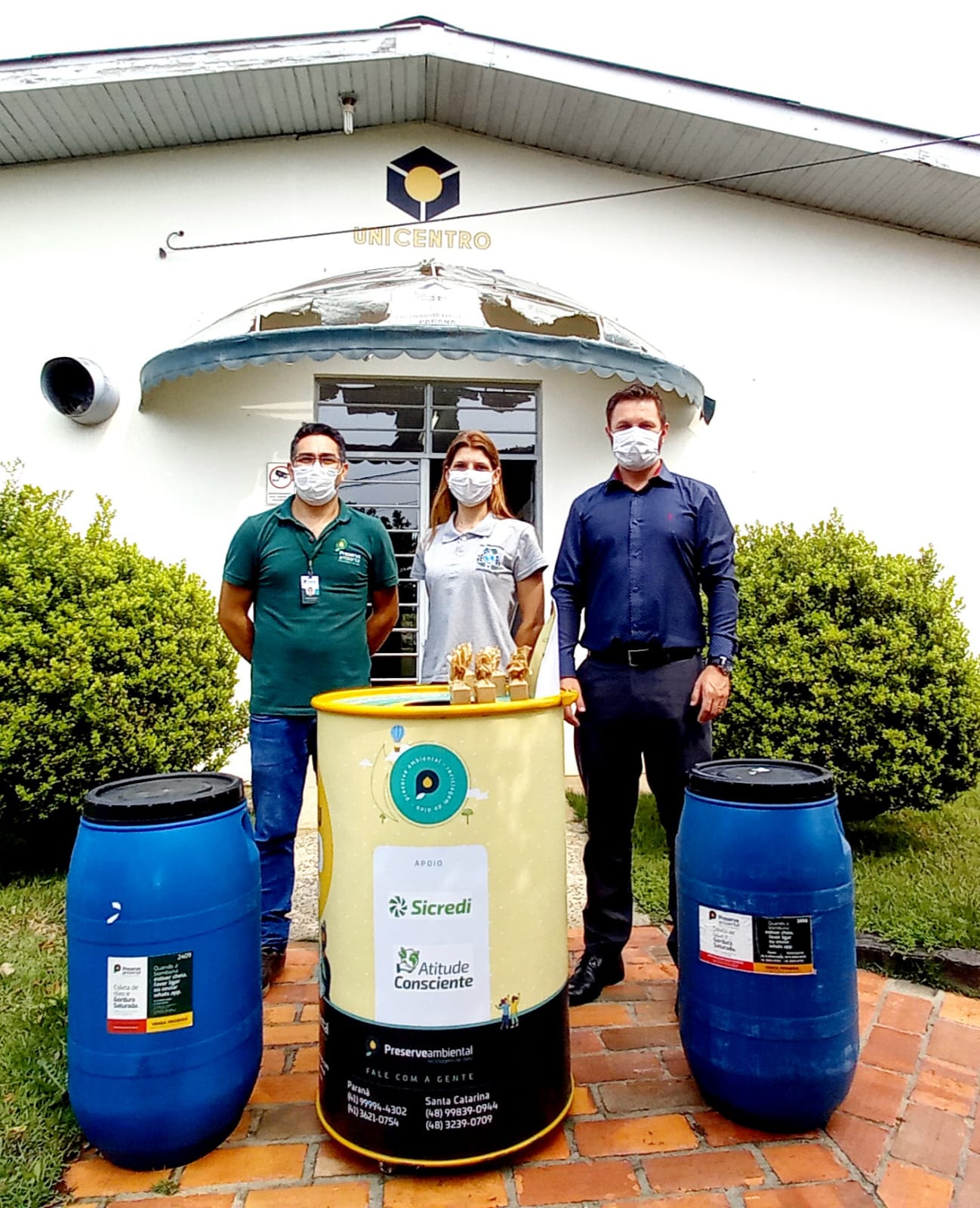 Foram instalados coletores nas agências do Sicredi no município de Irati(PR) e na Unicentro. O material arrecadado será transformado em produtos de limpeza doados a entidades assistenciais