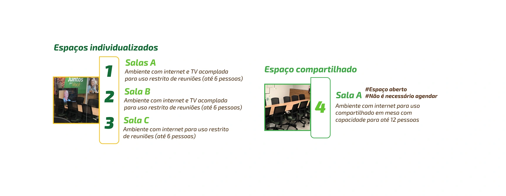 São 3 salas exclusivas que podem ser agendadas, além de uma sala de uso compartilhado.
