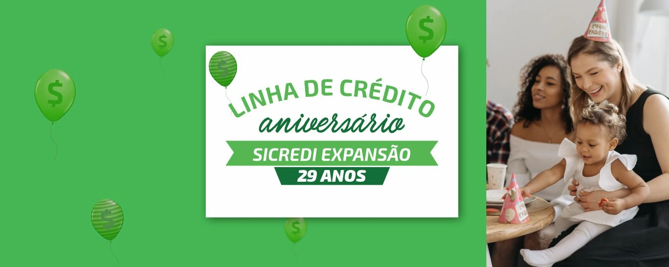 Neste mês, comemoramos nosso aniversário de 29 anos e, como já é tradição, você ganha uma linha de crédito mais que especial: são R$ 29 mil em 29 meses, com taxa diferenciada. Além de aproveitar essas condições para realizar um sonho ou resolver algum imprevisto financeiro, você também estará contribuindo para os resultados que receberá da Cooperativa, ao final do exercício.