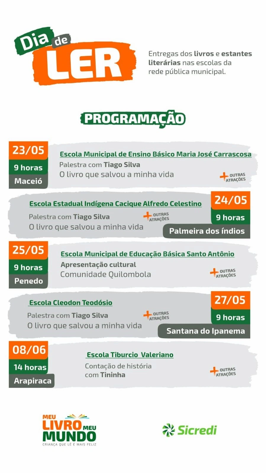 Em Alagoas, serão beneficiadas escolas em Maceió, Arapiraca, Palmeira dos Índios, Penedo, Santana do Ipanema, além de Salvador (BA). O projeto, cujo objetivo é estimular a leitura e, assim, abrir horizontes para a criançada, contou com a colaboração e participação efetiva dos associados da Sicredi Expansão.