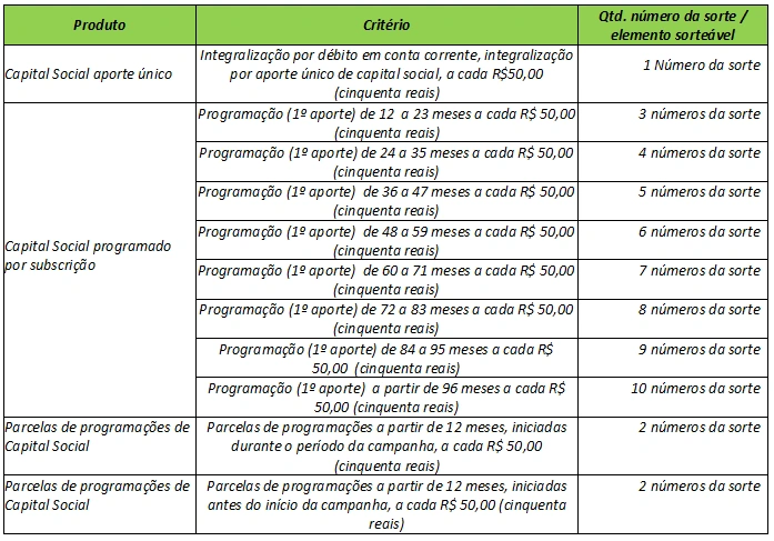 Além disso, há duas novidades na geração dos números da sorte: parcelas de programações de Capital Social a partir de 12 meses, iniciadas antes do início da campanha, darão direito a 2 números da sorte a cada R$ 50,00; e uma programação de Capital Social a partir de 12 meses, iniciada durante a campanha, darão direito a 2 números da sorte a cada R$ 50,00.