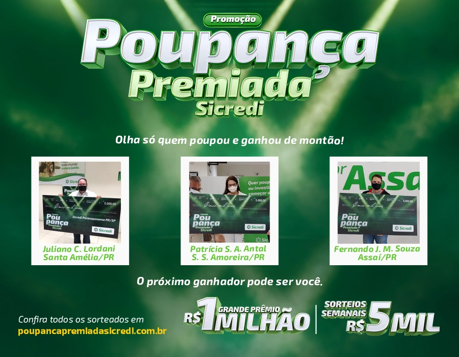 A tradicional promoção “Poupança Premiada”, realizada pelo Sicredi com objetivo de incentivar o planejamento financeiro e o hábito de poupar, já contemplou três associados na área de atuação da Sicredi Paranapanema PR/SP, que atua na região norte do Paraná e sudeste de São Paulo, com R$ 5 mil cada no sorteio semanal, que premia cinco poupadores todas as segundas-feiras. A campanha também tem um prêmio especial de R$ 500 mil, sorteado em outubro, celebrando o Dia Internacional da Poupança - além do grande sorteio final de R$ 1 milhão, em dezembro.