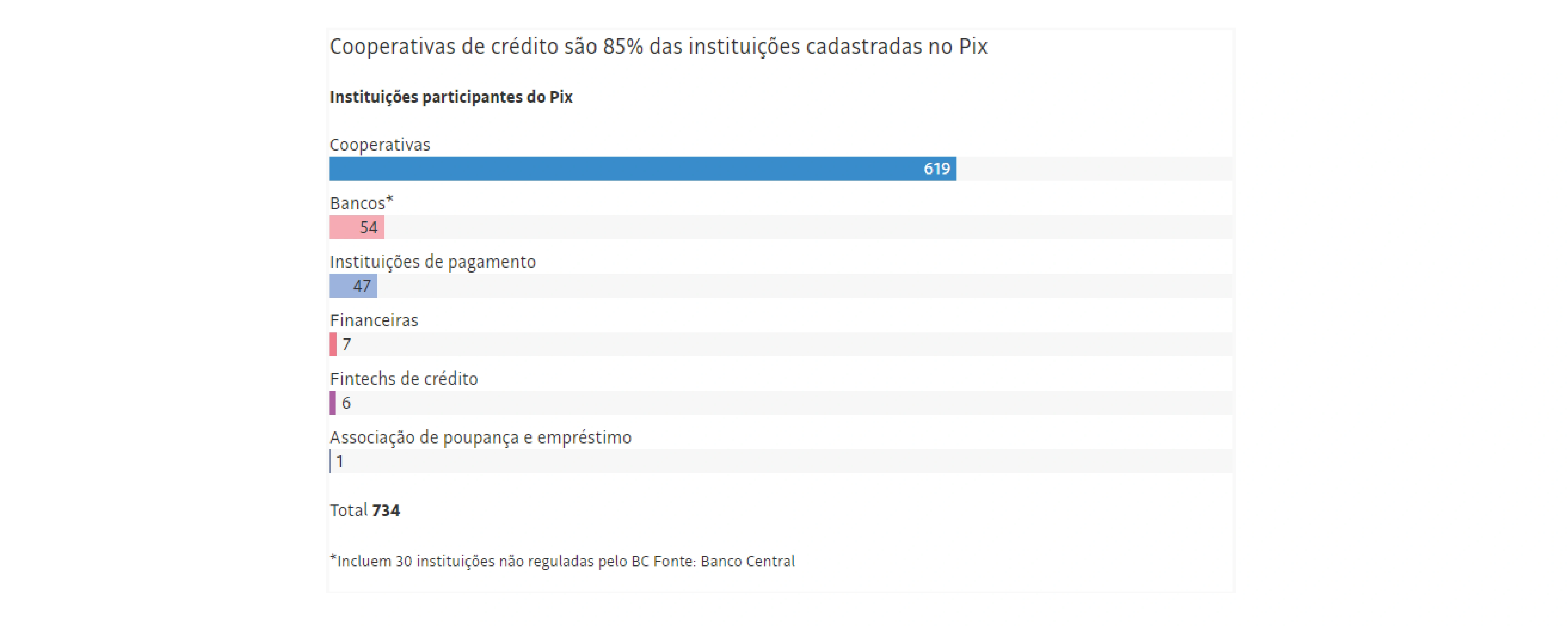As cooperativas de crédito respondem por 85% das instituições cadastradas no Pix, sistema brasileiro de pagamentos instantâneos. São 619 participantes. Os bancos aparecem em segundo lugar, com 54.