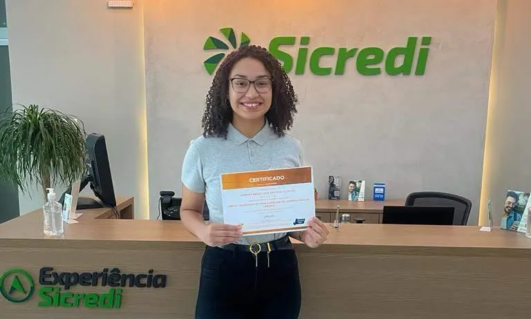 Foi em 2023 que uma formação em Mercado Financeiro veio acompanhada de uma oportunidade como jovem aprendiz na área de Governança da cooperativa Sicredi Integração PR/SC. Onze meses depois, ela foi efetivada como auxiliar de Desenvolvimento do Cooperativismo, função que exerce até hoje, conciliando o trabalho com a faculdade de Jornalismo.