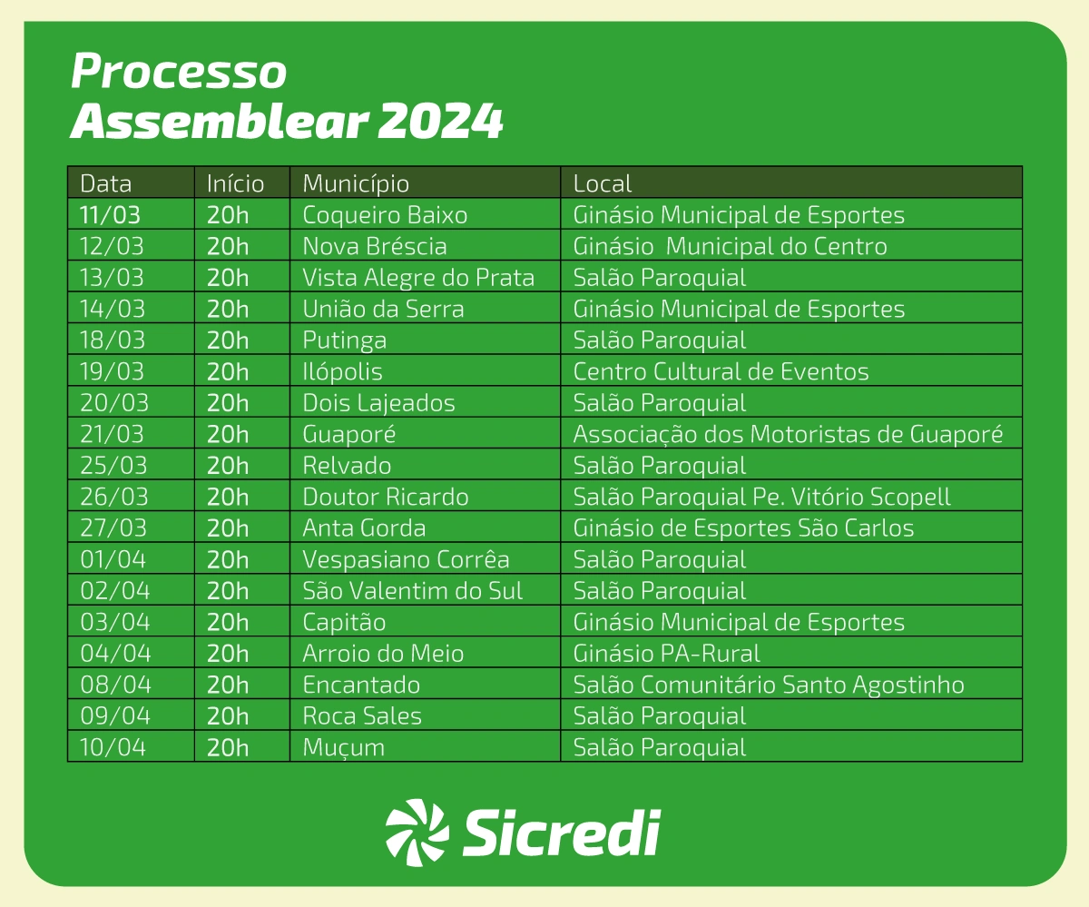 As assembleias são um momento em que os associados podem acompanhar a prestação de contas do exercício de 2023, as ações realizadas nas comunidades, as contribuições ao desenvolvimento da região e os benefícios gerados ao quadro social. As apresentações serão realizadas pelo Presidente do Sicredi Região dos Vales, Ricardo Cé; pelo Diretor Executivo, Roberto Scorsatto, e pelos gerentes das agências de cada cidade.