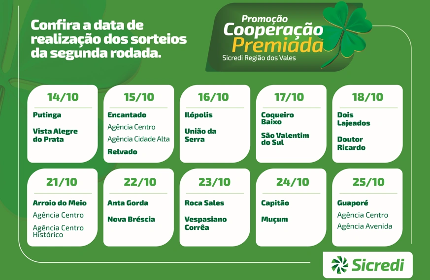 Entre os dias 14 e 25 de outubro, o Sicredi Região dos Vales realizará mais uma rodada de sorteios da Promoção Cooperação Premiada. Nesta segunda etapa, serão sorteados 100 cartões presente no valor de R$ 4 mil cada. O objetivo da campanha é valorizar os associados, a parceria ao longo dos anos e incentivar a economia local.