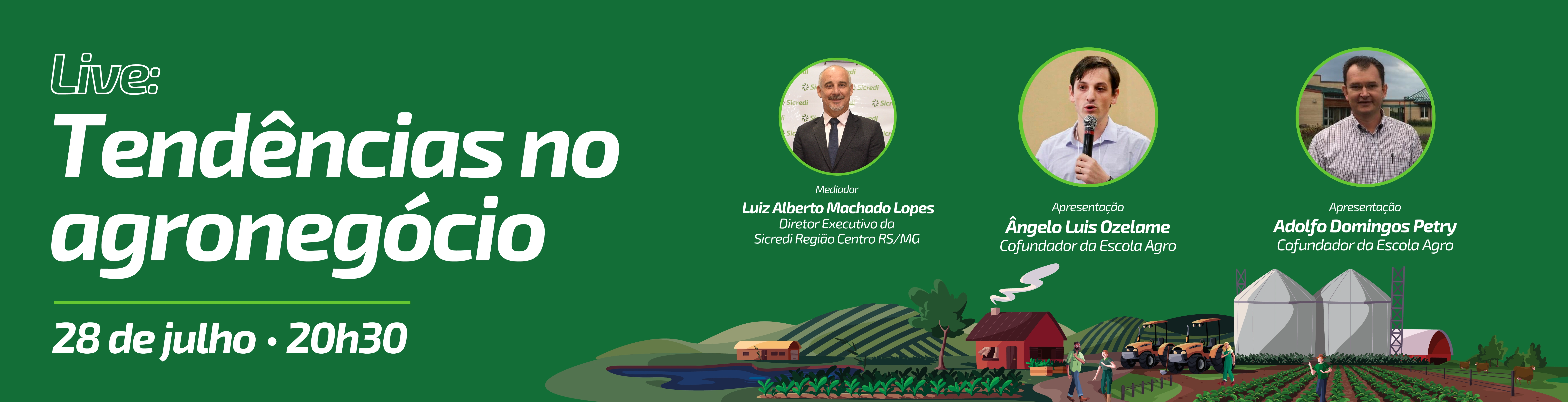 Com objetivo de compartilhar conhecimento com os seus associados a Sicredi Região Centro RS/MG realizará no dia 28/07 às 20h30 pelo seu Facebook e Youtube e pelo Facebook do Diário de Santa Maria a Live Tendências no Agronegócio mediada pelo Diretor Executivo da Cooperativa Luiz Alberto Machado Lopes e ministrada por Ângelo Luis Ozelame - Cofundador da Escola Agro, engenheiro agrônomo formado pela Faem/UFPel. MBE em Engenharia de produção e inovação pela UFRGS e Adolfo Domingos Petry – Cofundador da Escola Agro, médico veterinário formado na UFMS, MBA pela FGV em Gestão Empresarial.