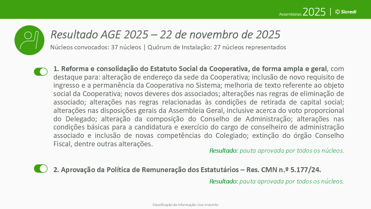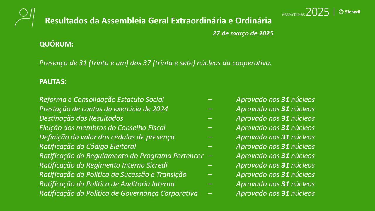 As assembleias da Sicredi Sementes do Sul foram realizadas de forma digital e presencial nas agências entre os dias 17 e 21 de março. Confira os resultados e documentações abaixo.