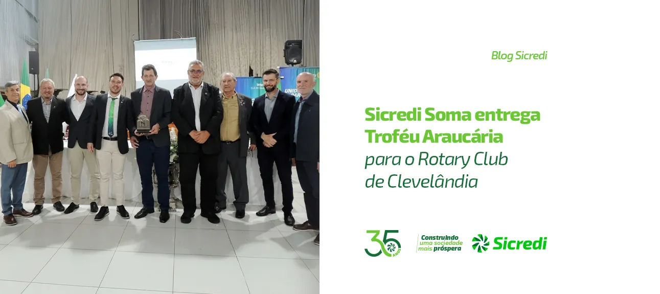 A Sicredi Soma entregou na última sexta-feira, 03, em Clevelândia, o Troféu Araucária para o Rotary Club do município. O ato de entrega contou com a presença do presidente da Sicredi Soma, Clemente Renosto, com colaboradores da agência da Cooperativa na cidade e com integrantes do Rotary.