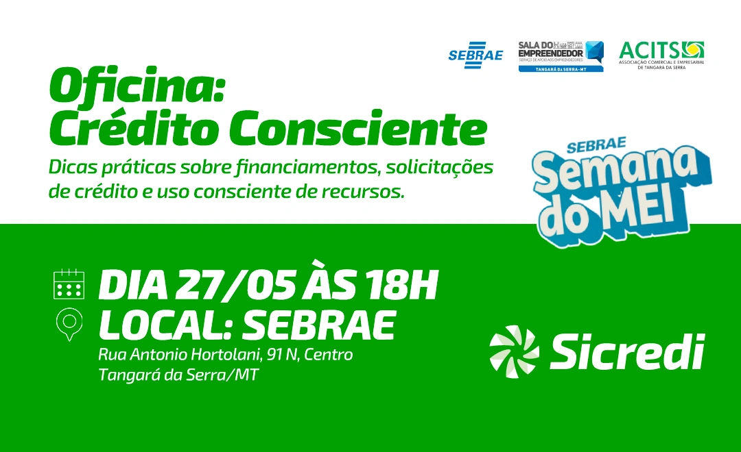 A Sicredi Sudoeste é parceira oficial do evento promovido pelo Sebrae em Tangará da Serra, que terá início no dia 26 de maio com uma programação voltada ao fortalecimento do Microempreendedor Individual (MEI). A iniciativa contará com diversas atividades de orientação e apoio aos empreendedores locais.