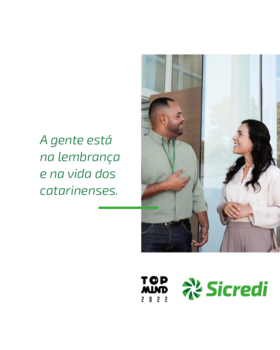 O Sicredi recebeu o Top of Mind, reconhecimento da NSC, em parceria com o Instituto Mapa, às marcas mais lembradas pelos catarinenses. A instituição financeira cooperativa ficou em 1º lugar na Pesquisa Top População na categoria denominada cooperativa de crédito estadual. O levantamento, que considera a primeira empresa que vem à mente do entrevistado, contou com 1.000 respostas de residentes das 30 cidades mais populosas do Estado.