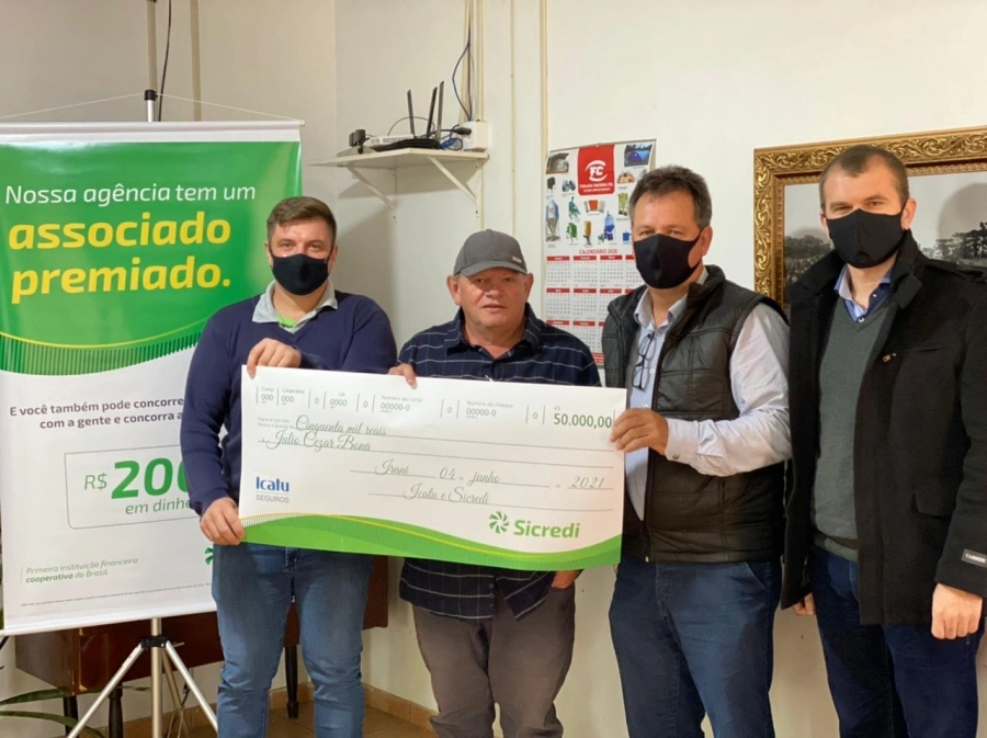 A Sicredi UniEstados realizou, na última quarta-feira, dia 02 de junho a entrega de mais um prêmio do Seguro de Vida a mais um associado da cooperativa. Desta vez, o prêmio do Seguro Mais em Vida, no valor de R$ 50 mil, foi para Julio Cezar Bona, de Irani/SC. Ele recebeu um cheque simbólico, que oficializou a entrega do prêmio das mãos do Presidente da Sicredi UniEstados, Adelar Parmeggiani, do Gerente da agência do Sicredi de Irani, Cassio Tonet e do Gerente Regional de Desenvolvimento da cooperativa, Evandro Varotto. O prêmio foi sorteado por meio da loteria federal, onde os associados concorrem com o número da apólice, em 4 sorteios mensais e podem ganhar até R$ 50.000,00*. O Seguro Mais em Vida coopera para garantir a sua segurança, proteger e dar segurança à família.