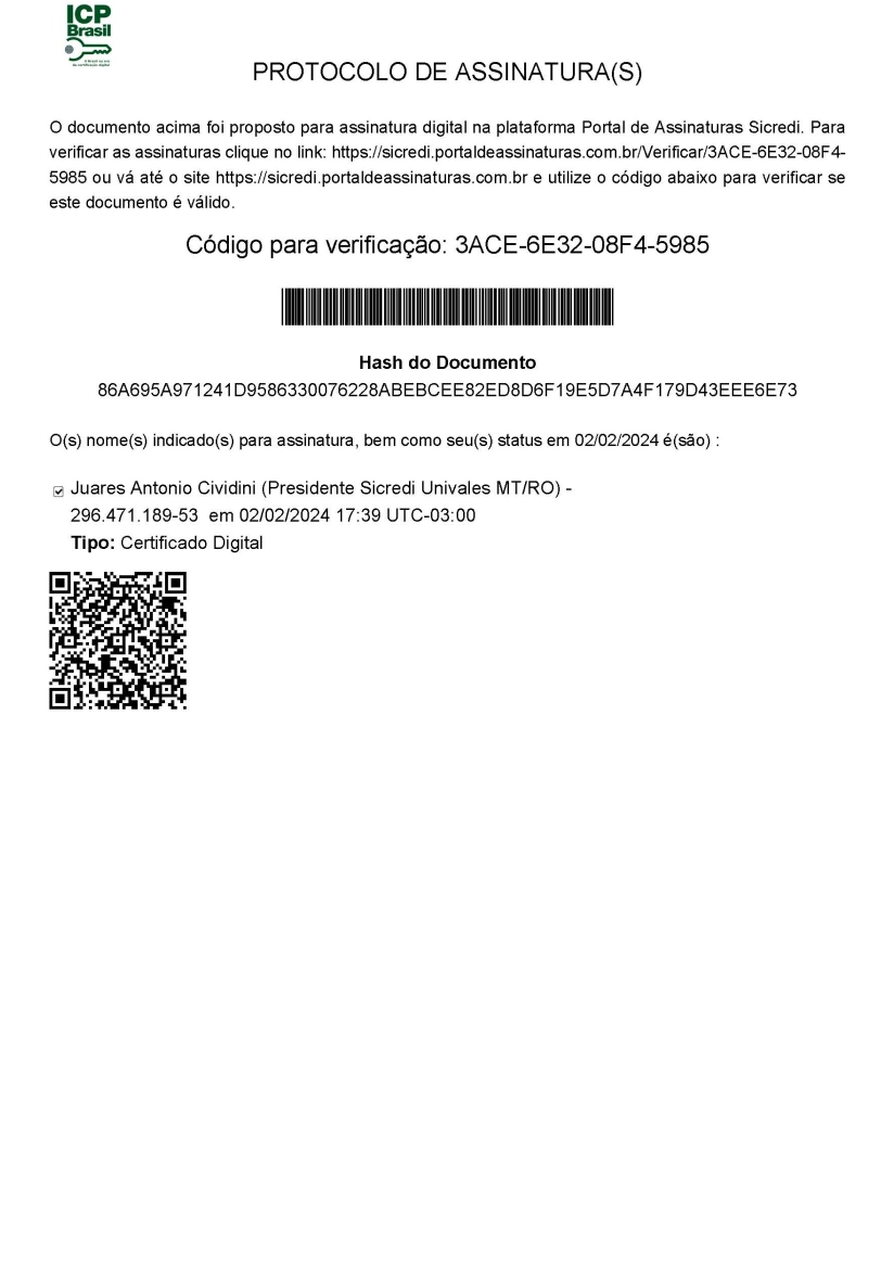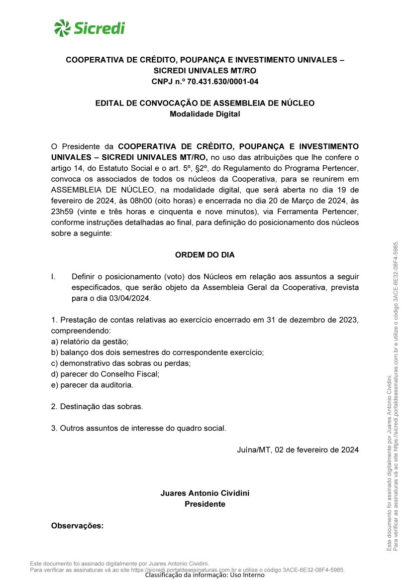 Com o objetivo de apresentar os resultados e decidir sobre as estratégias para 2024, as cooperativas do Sicredi darão início às assembleias anuais. Os encontros da Sicredi Univales ocorrerão entre os dias 19 de fevereiro a 20 de março no formato híbrido podendo ser acompanhada de forma presencial e digital no App Sicredi. Confira o edital a baixo:
