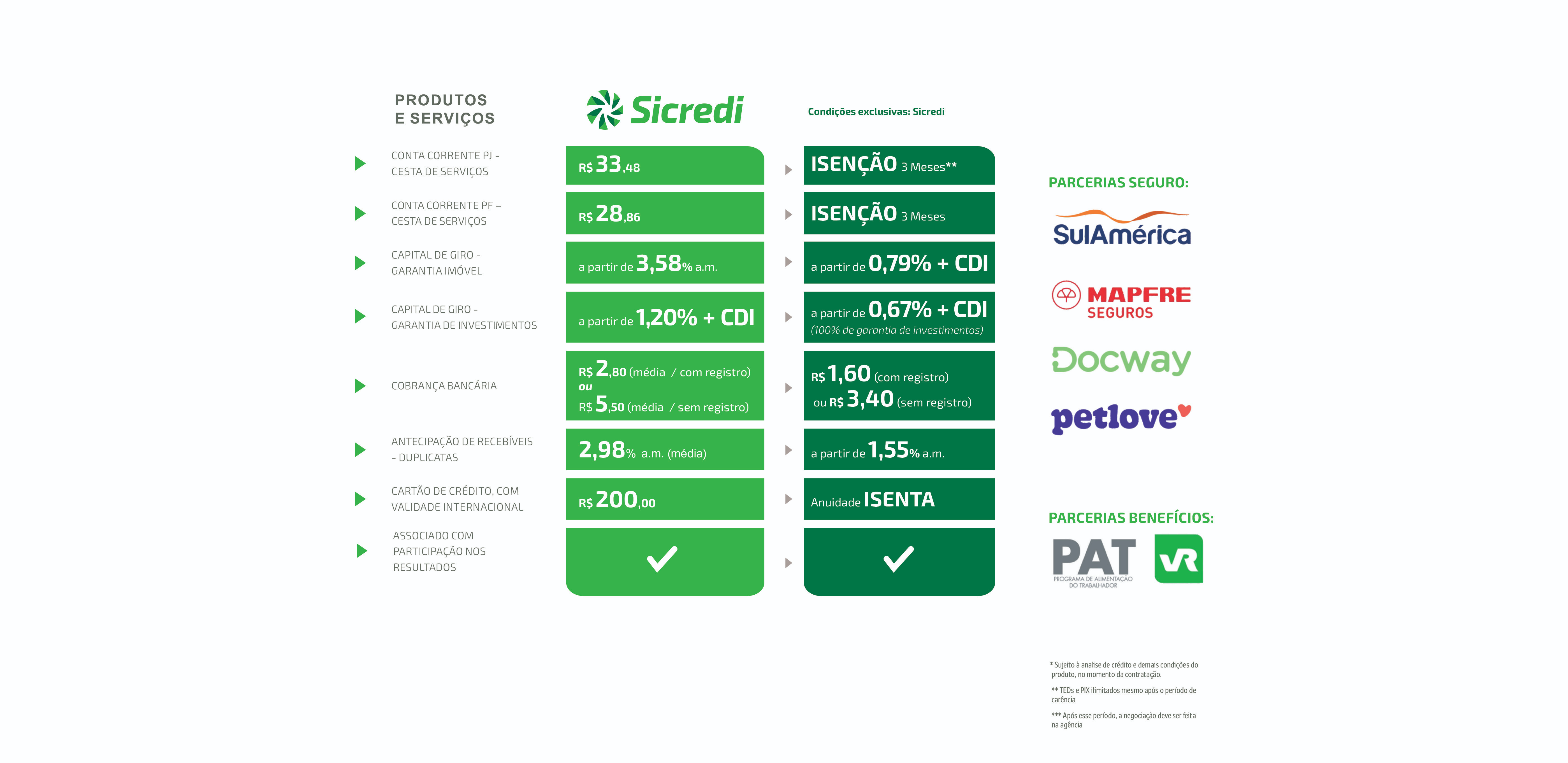 Com nossa parceria, agora você têm à disposição o amplo portfólio de produtos e serviços financeiros do Sicredi com taxas exclusivas.