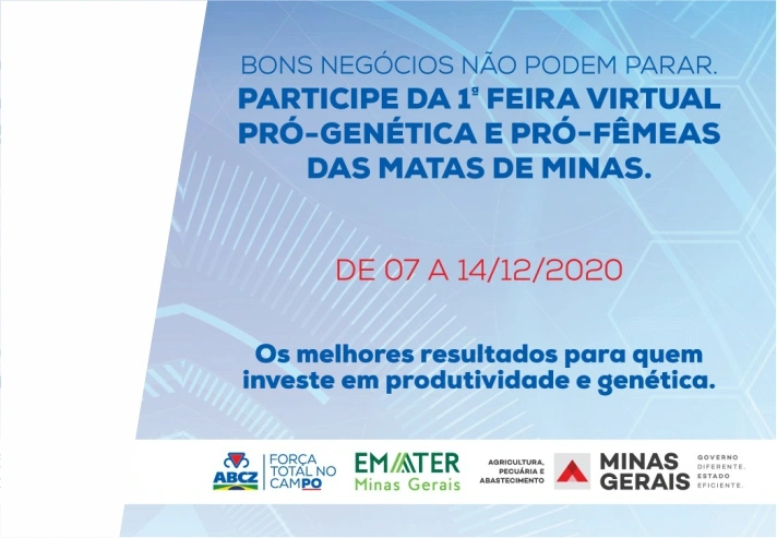 A 1ª Feira Virtual Pró-Genética e Pró-Fêmeas das Matas de Minas acontece de 07 a 14 de dezembro, os vídeos dos reprodutores e matrizes serão disponibilizados no site da ABCZ (www.abcz.org.br).