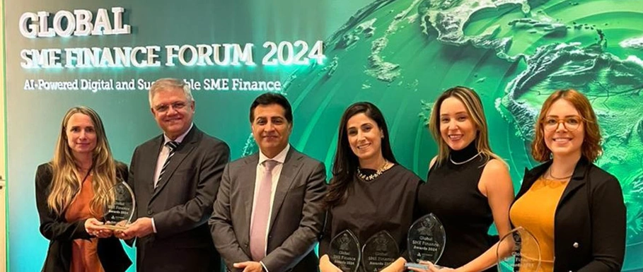 O SME Finance Awards 2024 ocorreu no dia 17/9, em São Paulo - SP, e reconheceu instituições de diversos lugares do mundo. A cerimônia fez parte do Global SME Finance Forum, um dos mais importantes eventos com foco em produtos e serviços financeiros para PMEs, reunindo mais de 700 líderes globais e formadores de opinião de quase 80 países, e ocorreu pela primeira vez no Brasil. Para debater tendências que estão moldando o futuro, neste ano, o tema foi o papel da Inteligência Artificial na aceleração das transformações digitais e sustentáveis na área das finanças.
