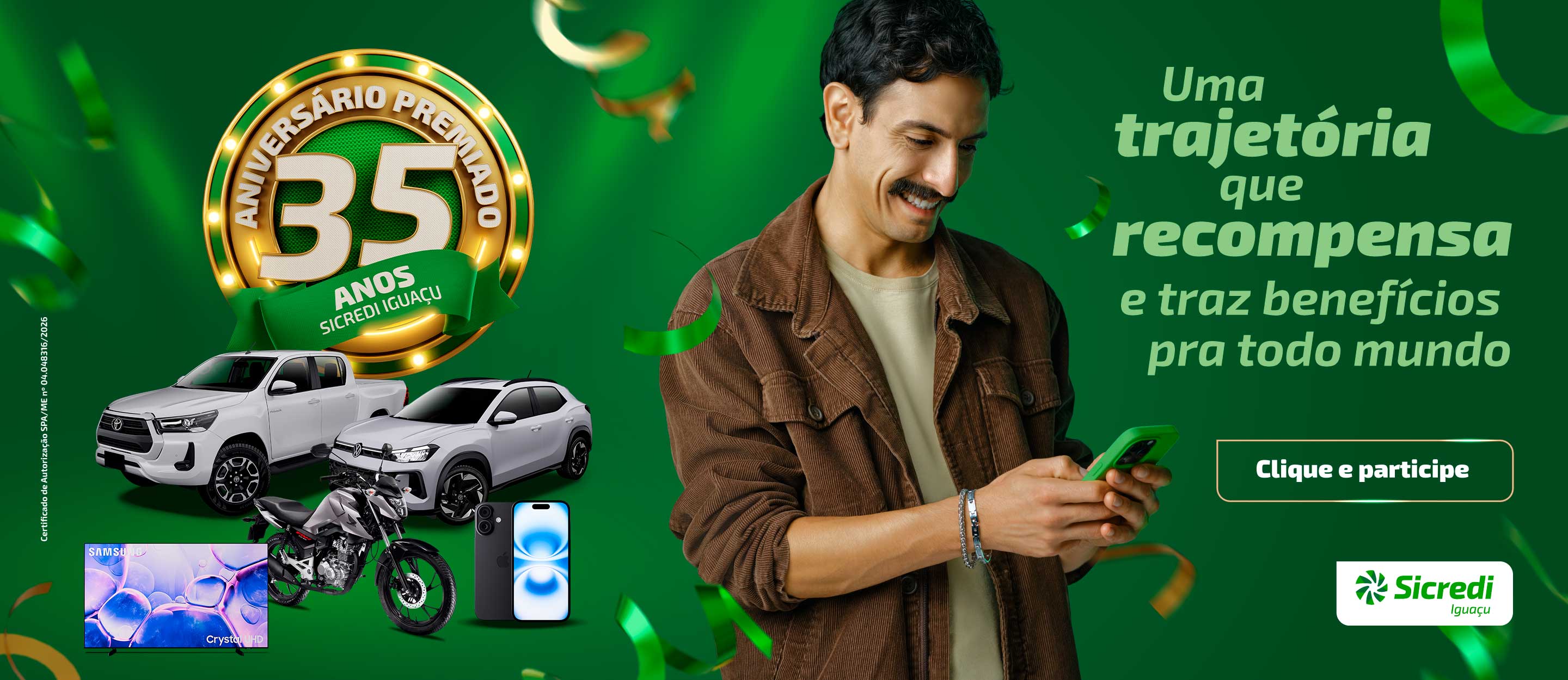 Contrate e concorra.Ao contratar produtos e serviços do Sicredi, você recebe números da sorte para os sorteios de uma Toyota Hilux, três Volkswagen Tera Comfort, 45 motos, 45 TVs, 10 iPhones e 200 vouchers do Shopping Sicredi.