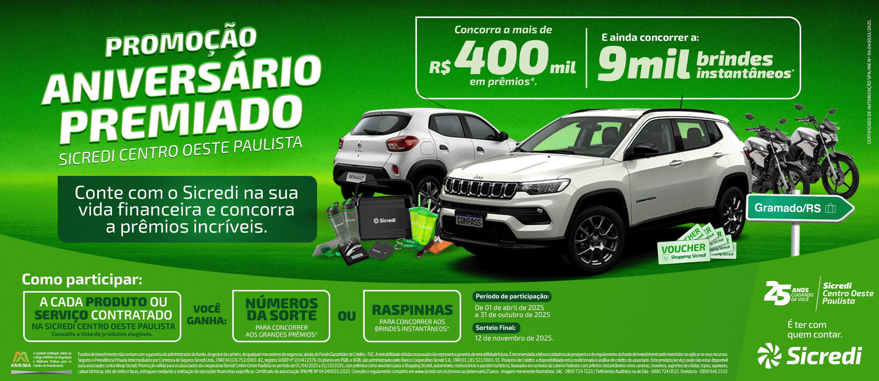 A campanha “Aniversario 25 anos” é destinada a todos(as) atuais e futuros(as) associados(as) da Sicredi Centro Oeste Paulista, pessoas físicas e/ou jurídicas, primeiros titulares de conta corrente, com exceção das pessoas impedidas listadas no regulamento, residentes em território nacional.