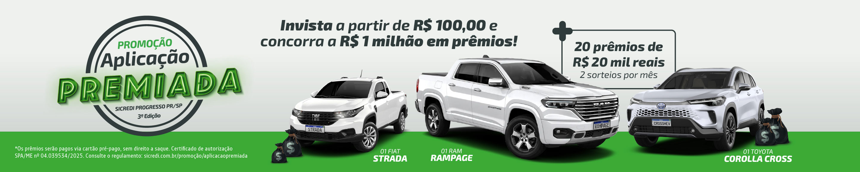 CERTIFICADO DE AUTORIZAÇÃO SEAE nº 04.039534/2025. Fundos de investimento não contam com a garantia do administrador do fundo, do gestor da carteira, de qualquer mecanismo de seguro ou, ainda, do Fundo Garantidor de Crédito - FGC. A rentabilidade obtida no passado não representa garantia de rentabilidade futura. É recomendada a leitura cuidadosa do prospecto e do regulamento do fundo de investimento pelo investidor ao aplicar os seus recursos. Seguros e Previdência Privada Intermediados por Corretora de Seguros Sicredi Ltda., CNPJ 04.026.752/0001-82, registro SUSEP n° 10.0412376. Os planos em PGBL e VGBL são administrados pelo Banco Cooperativo Sicredi S.A., CNPJ 01.181.521/0001-55. Produtos de Crédito: a disponibilidade está condicionada à análise de crédito do associado. Contate o atendimento no seu app para maiores informações. Promoção válida durante o período de 03/02/2025 a 30/11/2025, para os associados da cooperativa Sicredi Progresso PR/SP, conforme o certificado de autorização SPA/ME nº 04.039534/2025. Consulte o regulamento completo da promoção e condições de contratação nas unidades de atendimento participantes e no site sicredi.com.br/promocoes. Imagens meramente ilustrativas. SAC - 0800 724 7220 / Deficientes Auditivos ou de Fala - 0800 724 0525. Ouvidoria - 0800 646 2519.