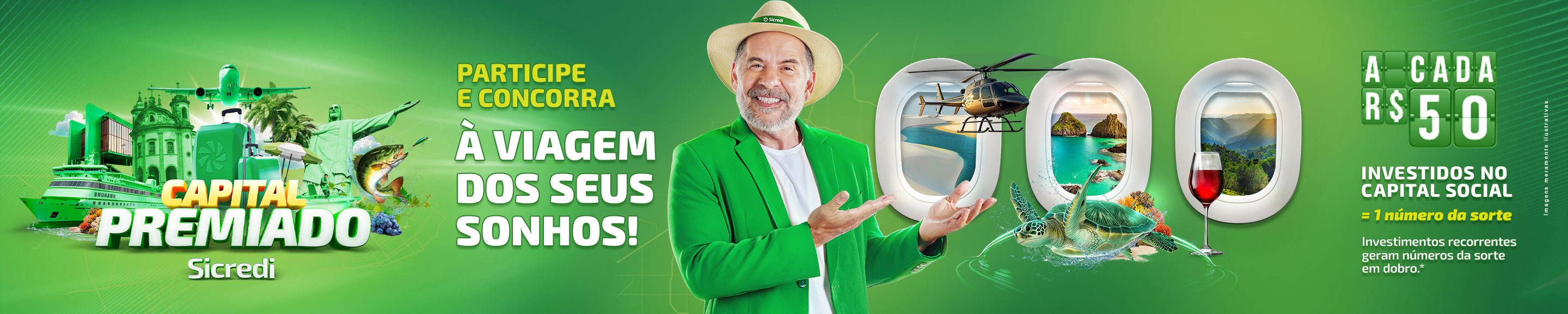 CERTIFICADO DE AUTORIZAÇÃO SPA/ME N.° 04.047765/2026 * Em dobro: se aplica a números da sorte gerados para subscrições/parcelas de capital programado. Promoção válida durante o período de 10/02/2026 a 30/11/2026, para associados das cooperativas listadas em regulamento. Consulte regulamento completo da promoção, número do certificado de autorização e condições de contratação nas unidades de atendimento participantes e no site: www.sicredi.com.br/promocao/capitalpremiado. Imagens meramente ilustrativas. Os prêmios de viagem serão entregues por meio de vale-viagem, para uso em território nacional, sendo os destinos divulgados meras sugestões de utilização. Os prêmios no valor de R$ 1.000,00, e prêmio final no valor de R$ 500.000,00, serão concedidos por meio de cartão de débito, sem funções de saque ou transferência. SAC - 0800 724 7220 / Deficientes Auditivos ou de Fala - 0800 724 0525. Ouvidoria - 0800 646 2519.
