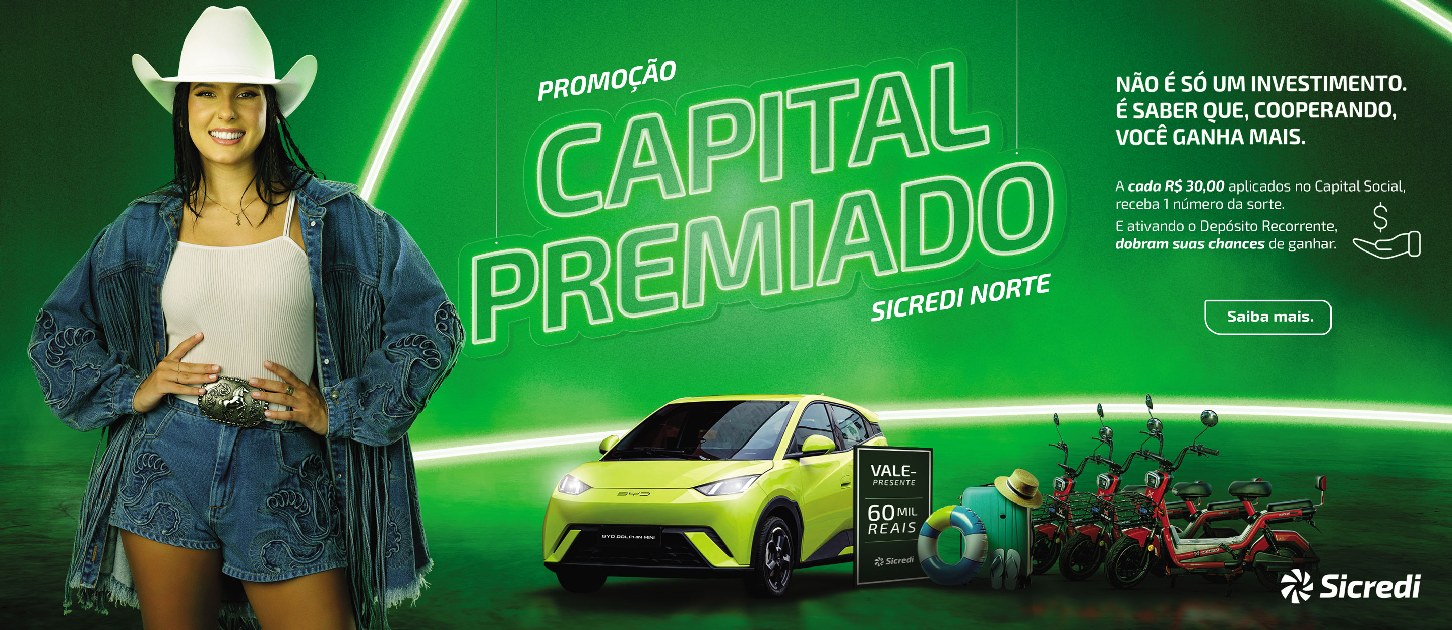 Essa promoção não precisa de inscrição. Você só precisa ser associado da Sicredi Norte para acumular números da sorte e participar dos sorteios. A cada trinta reais (R$ 30,00) integralizados em sua conta capital a partir do dia 02/09/2024, você recebe um número da sorte e, a cada trinta reais (R$ 30,00) integralizados na modalidade capital social programado, você receberá números da sorte em dobro. Todas as integralizações que você fizer em sua conta capital geram números da sorte para participar dos 65 sorteios que ocorrem de setembro de 2024 a fevereiro de 2025. Quanto mais você integralizar, mais chances tem de ganhar. Viu como é fácil? Comece agora!