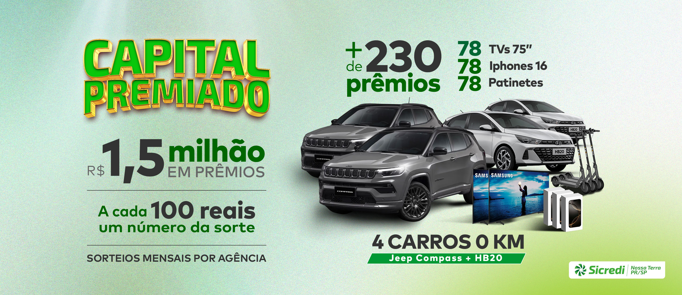 A promoção conta com sorteios mensais de 1 Tv, 1 patinete e 1 Iphone (em intercalados por mês e por agência) ao longo do ano. Sendo em julho o sorteio de 02 HB20 e dezembro de 02 Jepp Compass. Confira as datas de cada extração da loteria federal: 26/02/25; 26/03/25; 30/04/2025; 28/05/2025; 25/06/2025; 30/07/2025; 27/08/2025; 24/09/2025; 29/10/2025; 26/11/2025 e 27/12/2025.