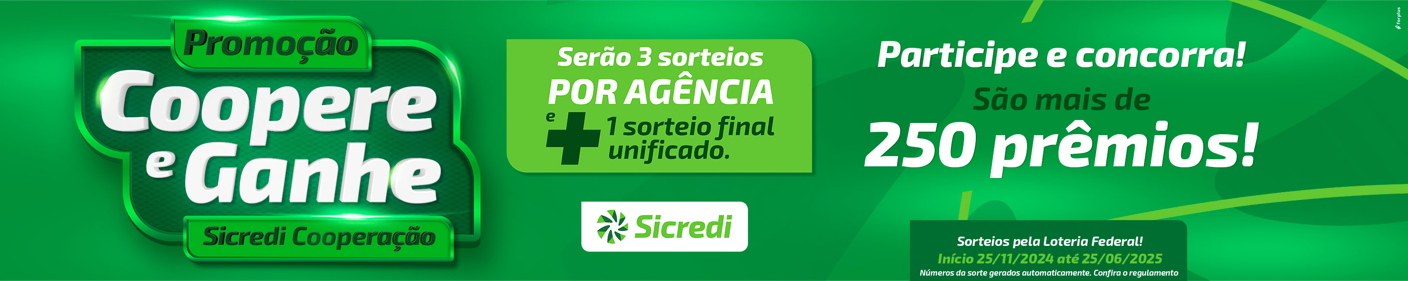 CERTIFICADO DE AUTORIZAÇÃO SEAE nº 04.038658/2024. Fundos de investimento não contam com a garantia do administrador do fundo, do gestor da carteira, de qualquer mecanismo de seguro ou, ainda, do Fundo Garantidor de Crédito - FGC. A rentabilidade obtida no passado não representa garantia de rentabilidade futura. É recomendada a leitura cuidadosa do prospecto e do regulamento do fundo de investimento pelo investidor ao aplicar os seus recursos. Seguros e Previdência Privada Intermediados por Corretora de Seguros Sicredi Ltda., CNPJ 04.026.752/0001-82, registro SUSEP n° 10.0412376. Os planos em PGBL e VGBL são administrados pelo Banco Cooperativo Sicredi S.A., CNPJ 01.181.521/0001-55. Produtos de Crédito: a disponibilidade está condicionada à análise de crédito do associado. Este produto/serviço pode não estar disponível para associados conta Woop Sicredi. Contate o atendimento no seu app para maiores informações. Promoção válida durante o período de 25/11/2024 a 27/06/2025, para os associados da cooperativa Sicredi Cooperação. Consulte o regulamento completo da promoção e condições de contratação nas unidades de atendimento participantes e no site sicredi.com.br/promocoes. Imagens meramente ilustrativas. SAC - 0800 724 7220 / Deficientes Auditivos ou de Fala - 0800 724 0525. Ouvidoria - 0800 646 2519. O participante que desejar exercer o direito de desistência da participação desta campanha promocional, conforme regulamento de CERTIFICADO DE AUTORIZAÇÃO SPA/ME Nº 04.038658/2024, deverá enviar um e-mail para o endereço coop0211_mkt@sicredi.com.br contendo seu nome completo, cooperativa e conta, confirmando sua desistência lembrando que essa é irrevogável.