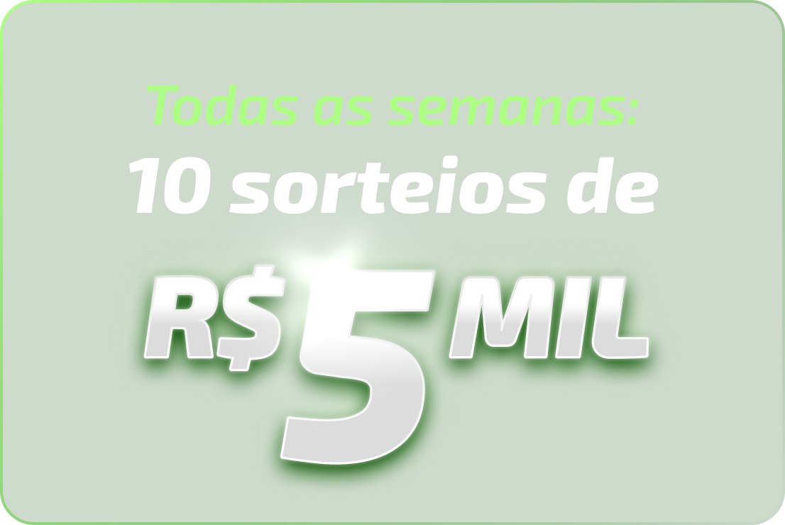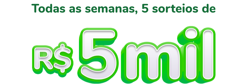 • Sorteios semanais de cinco mil reais (R$ 5.000,00): 22/02/2025, 01/03/2025, 08/03/2025, 15/03/2025, 22/03/2025, 29/03/2025, 05/04/2025, 12/04/2025, 19/04/2025, 26/04/2025, 03/05/2025, 10/05/2025, 17/05/2025, 24/05/2025, 31/05/2025, 07/06/2025, 14/06/2025, 21/06/2025, 28/06/2025, 05/07/2025, 12/07/2025, 19/07/2025, 26/07/2025, 02/08/2025, 09/08/2025, 16/08/2025, 23/08/2025, 30/08/2025, 06/09/2025, 13/09/2025, 20/09/2025, 27/09/2025, 04/10/2025, 11/10/2025, 18/10/2025, 25/10/2025, 01/11/2025, 08/11/2025 15/11/2025, 22/11/2025, 29/11/2025, 06/12/2025, 13/12/2025.