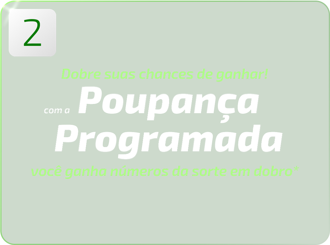 Apenas valores aplicados na poupança a partir da data de início da promoção irão gerar números da sorte. Ou seja, depósitos a partir de 10/02/2025 participam da promoção. Se você já tinha uma Poupança Programada contratada por mais de 12 meses realizada antes do dia 10/02/2025, você acumula números da sorte simples a partir dos novos acréscimos de saldo a partir desta data, desde que eles sejam iguais ou superiores a R$ 100,00. Para ter direito a números em dobro na Poupança Programada Sicredi, ela precisa ser cadastrada a partir do dia 10/02/2025. Converse com o seu gerente.