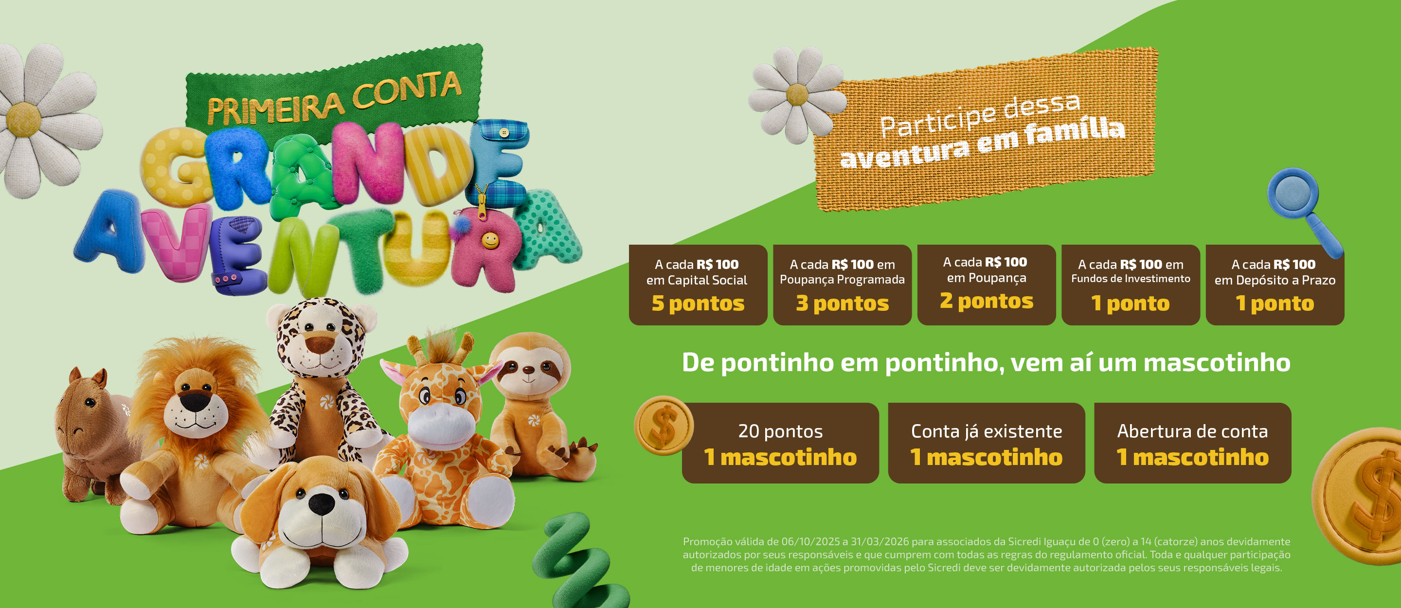 É uma campanha promocional, realizada pela Sicredi Iguaçu, que tem como objetivo incentivar o hábito de investir e poupar entre crianças e adolescentes de 0 (zero) a 14 (quatorze) anos. Ao acumularem pontos com depósitos em Poupança, Poupança Programada, Capital Social, Fundos de Investimento e Depósito a Prazo, os participantes regatam pelúcias, chamadas de Mascotinho Iguaçu. Ah, e na abertura de conta o associado já ganha automaticamente uma pelúcia.