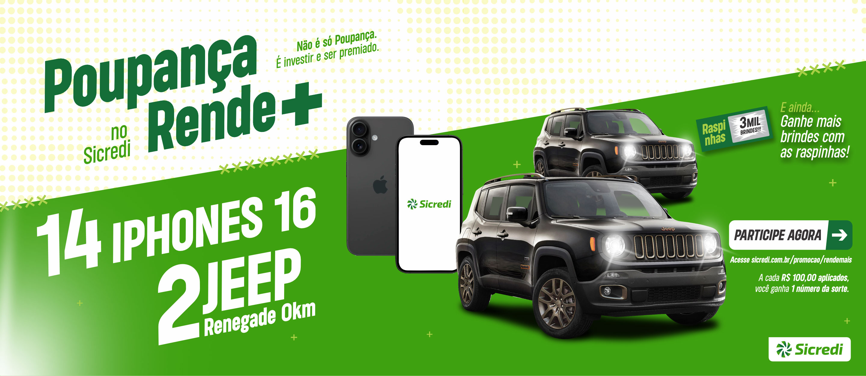 Ao final da campanha, será sorteado automóvel 0km da marca Jeep, modelo Renegade T270 4x2, motor 1.3 turbo. Confira as datas de cada extração da loteria federal: 09/04/2025, 10/05/2025, 11/06/2025, 09/07/2025, 11/06/2025, 09/08/2025, 10/09/2025, 11/10/2025, 08/11/2025, 10/01/2026.