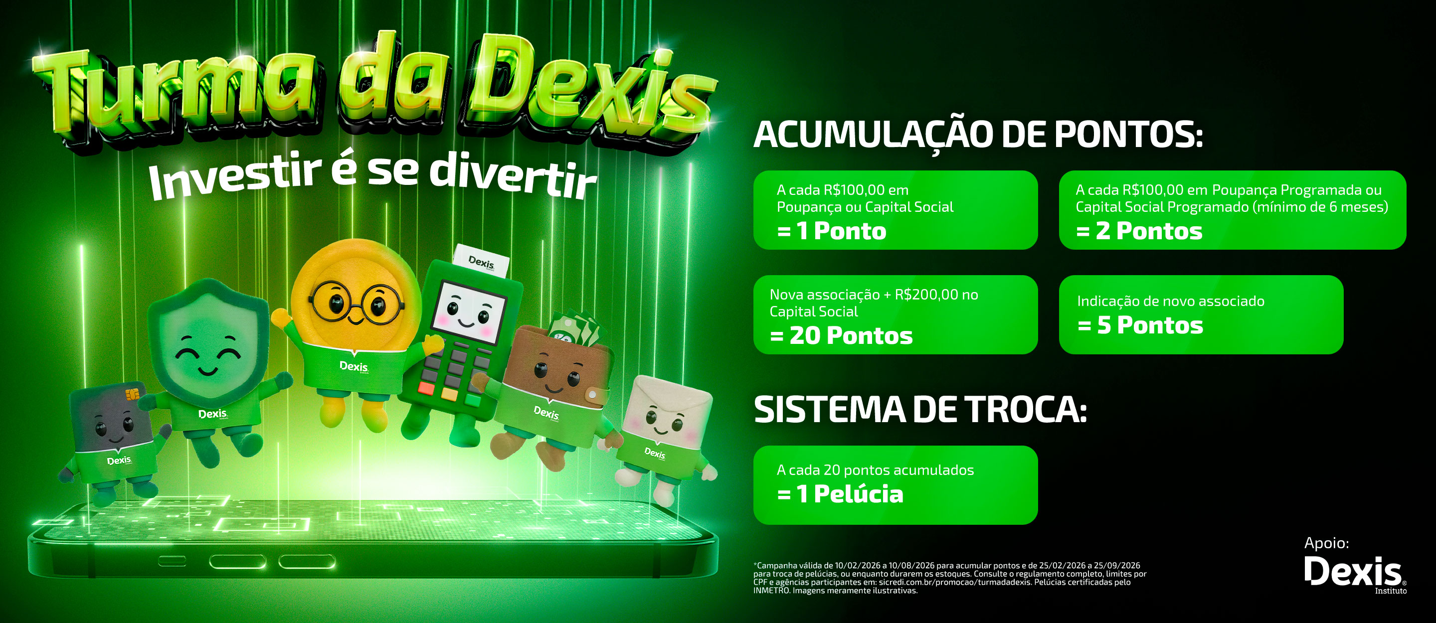 Esta campanha foi criada para incentivar o hábito de investir com consciência, promovendo educação financeira para todos os associados. Ao acumular pontos com depósitos na poupança, no capital social e abrir uma conta corrente, você pode resgatar os personagens exclusivos da Turma da Dexis.